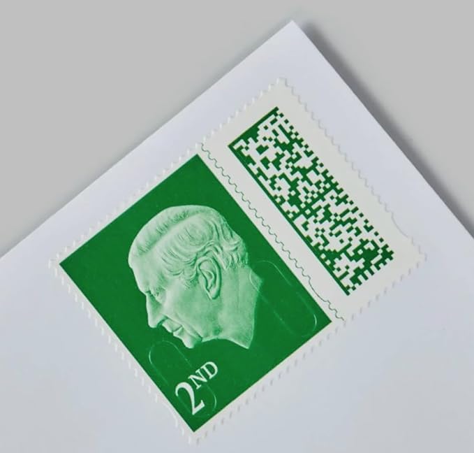 A book of 8 x Second Class King Charles Definitive Stamps printed in Holly Green.