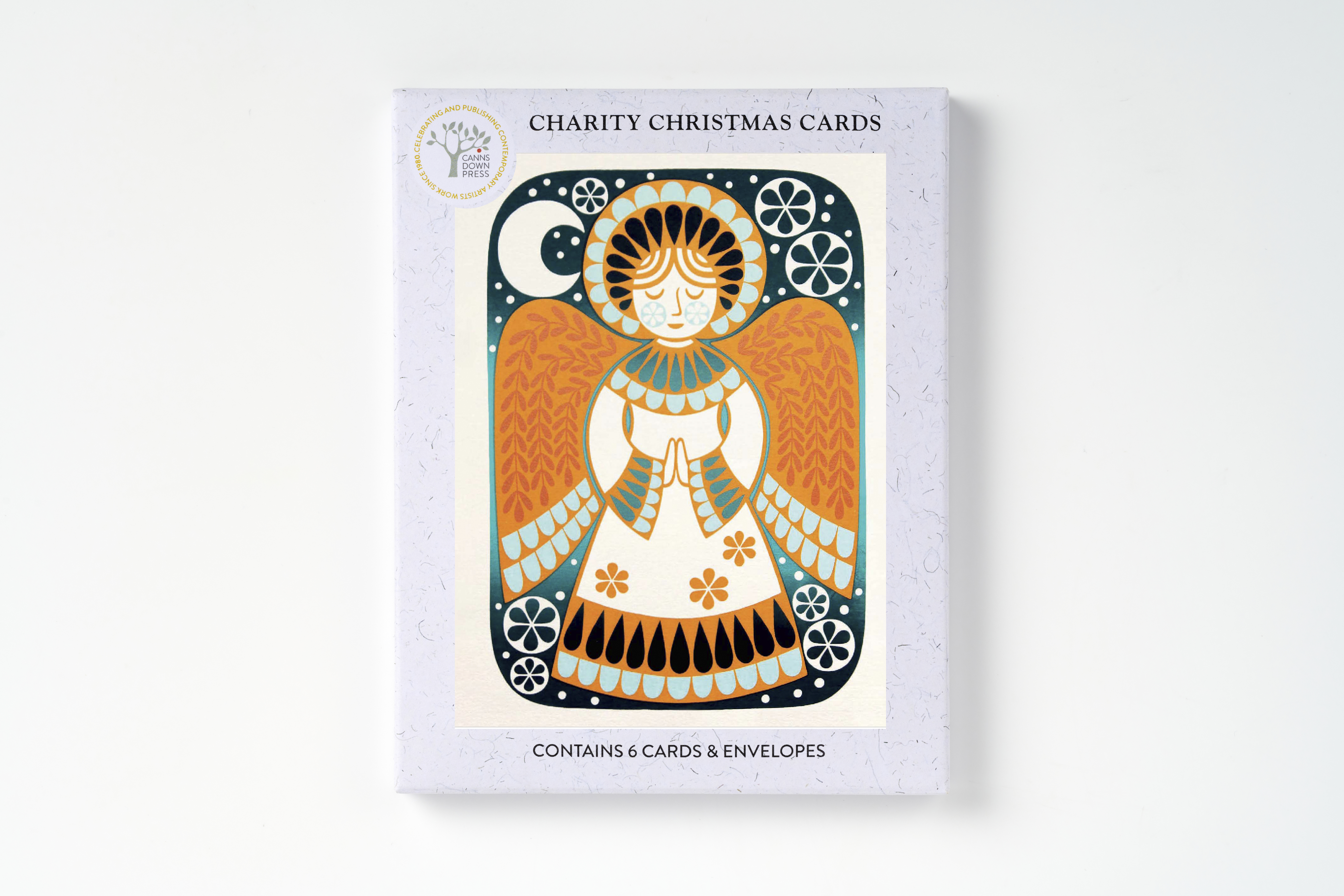 Packed in a recycled card box containing six cards of the same image and comes with six white envelopes.