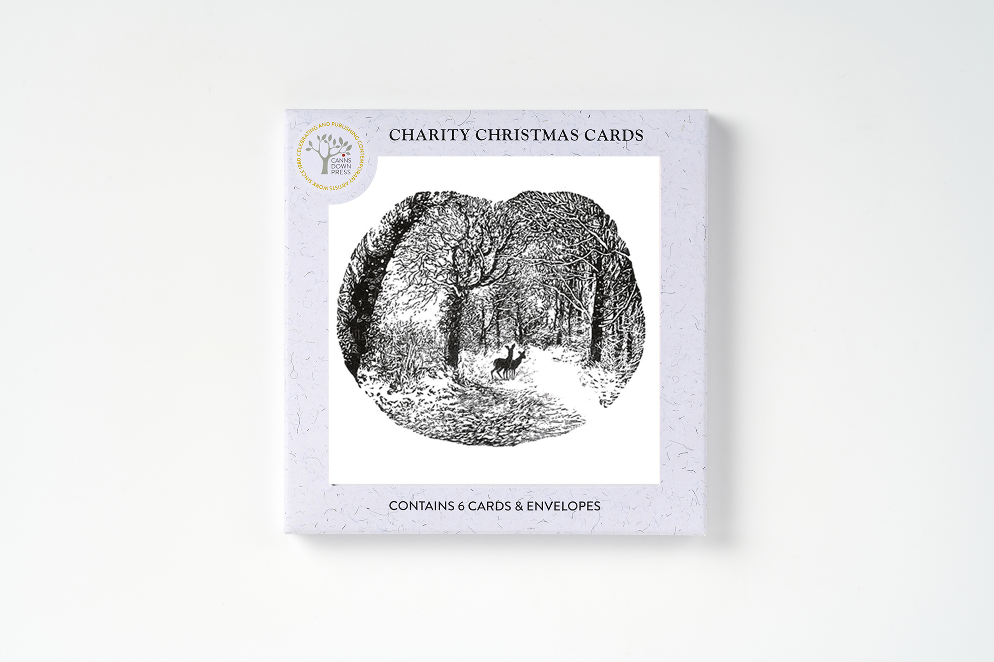 Packed in a recycled card box containing six cards of the same image and comes with six white envelopes.