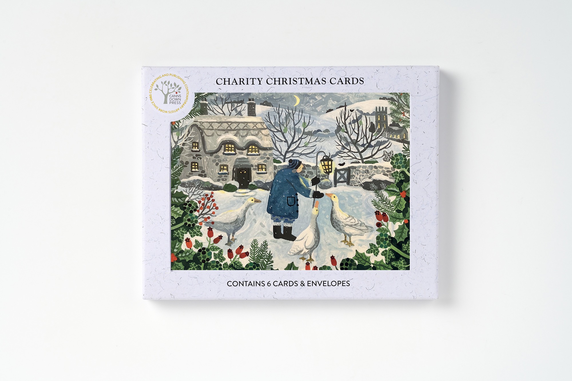 Packed in a recycled card box containing six cards of the same image and comes with six white envelopes.