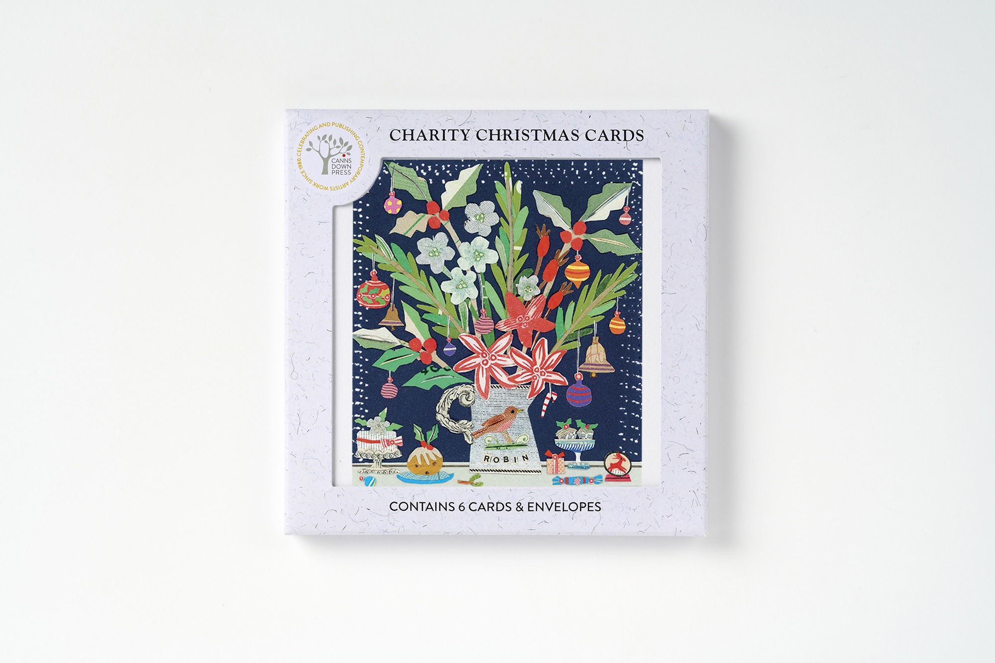 Packed in a recycled card box containing six cards of the same image and comes with six white envelopes.