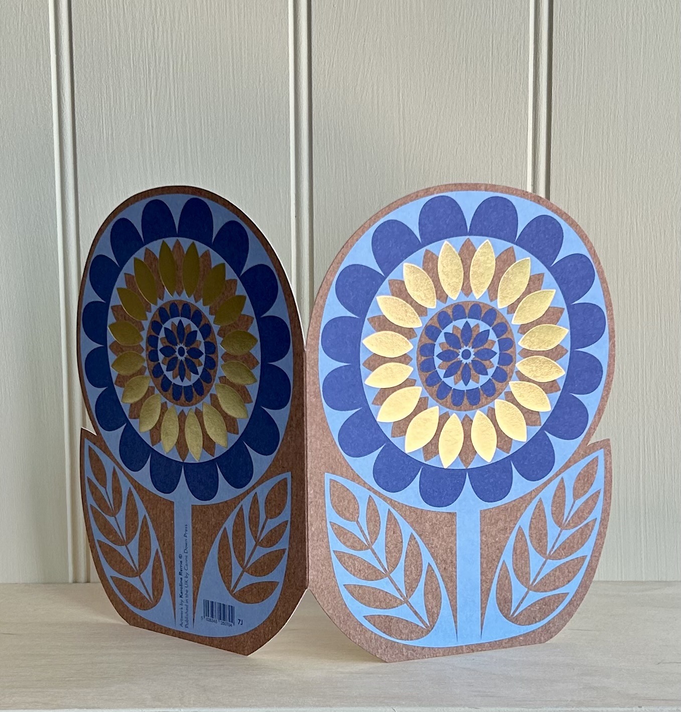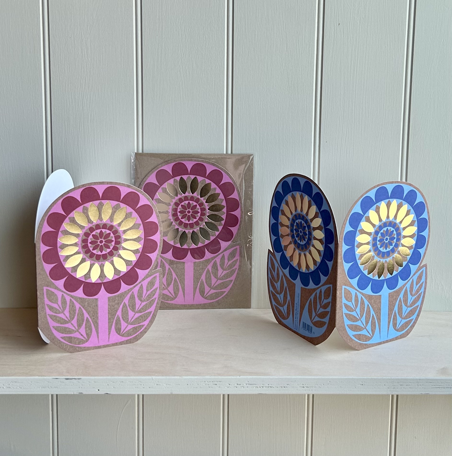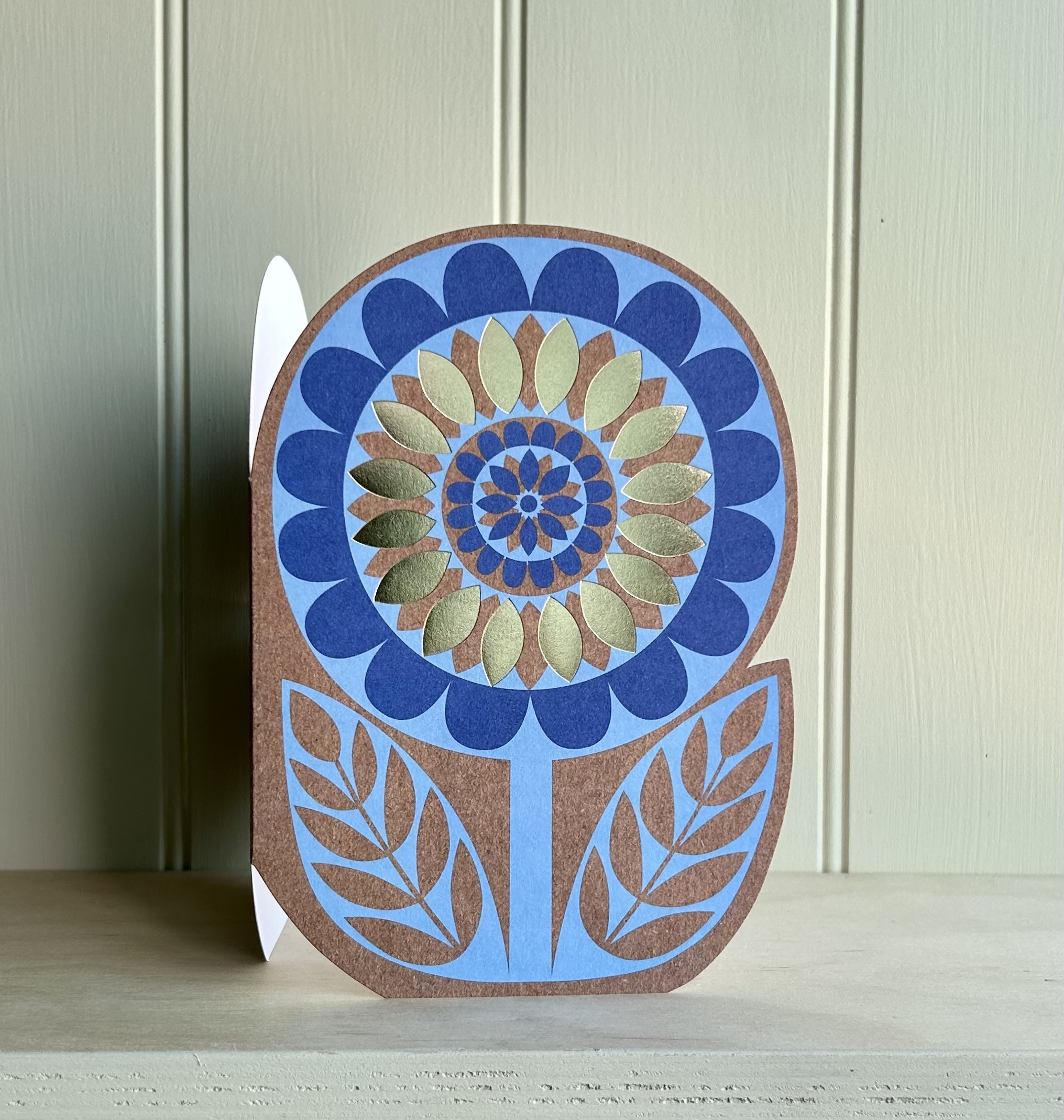 A vibrant cut out flower card which is available in pink or blue and has gold foil petals featured on both sides to add a luxurious element.